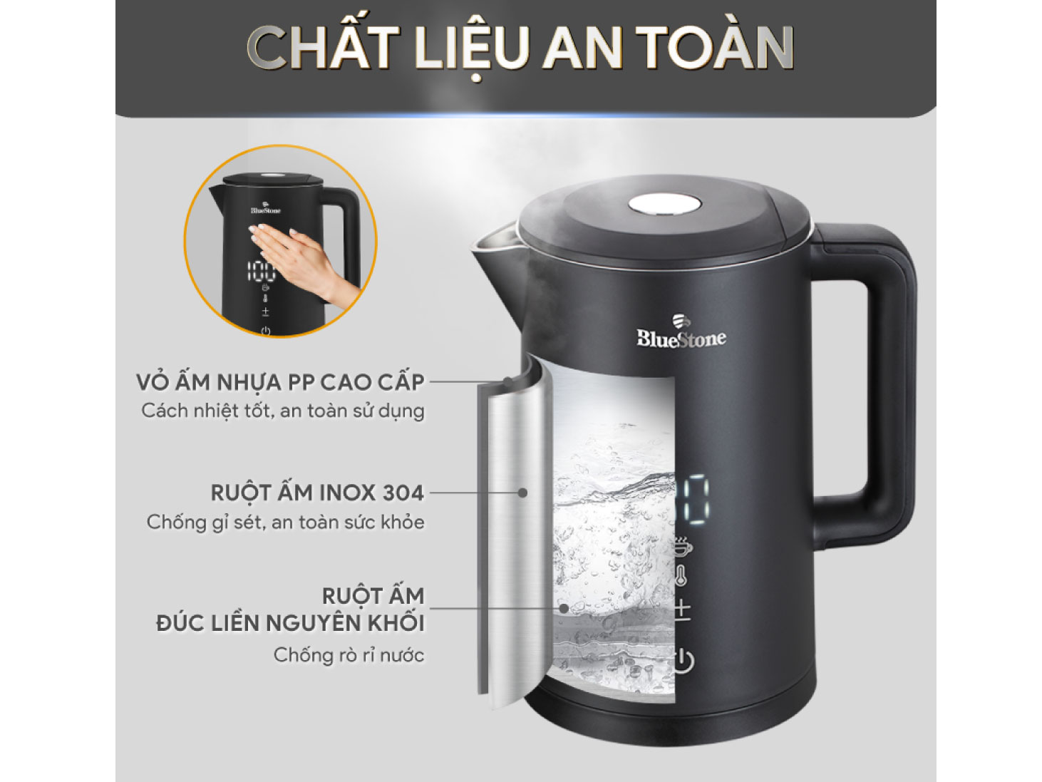 An toàn là ưu tiên hàng đầu. Ấm siêu tốc BlueStone KTB-3466 được trang bị hệ thống an toàn tự động, bao gồm các tính năng: