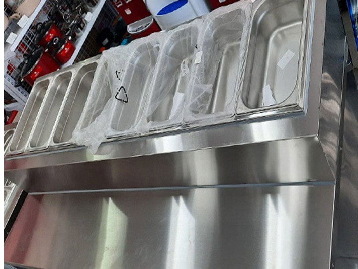 Mặt bàn thiết kế nửa dạng thớt – nửa khay topping giúp vừa sơ chế vừa trưng bày nguyên liệu một cách linh hoạt, phù hợp với môi trường làm việc chuyên nghiệp.