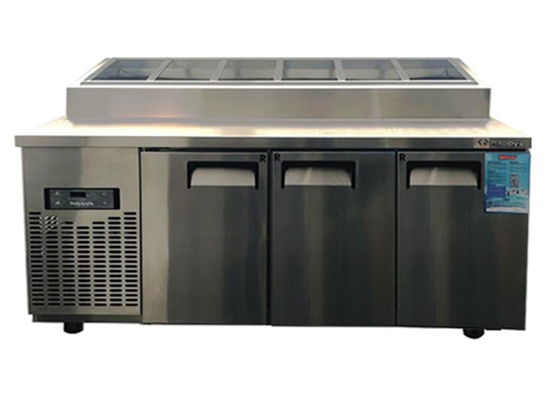 Bàn mát HWA-1800TP sở hữu thiết kế thông minh với khoang lạnh nằm bên dưới, chia thành 3 cánh mở độc lập giúp tối ưu hóa việc lưu trữ thực phẩm, đồ uống hoặc nguyên liệu tươi sống. Phía trên mặt bàn là khu vực topping, được bố trí sẵn các khay đựng (không kèm khay), cho phép người dùng dễ dàng phân loại và trưng bày nguyên liệu, đặc biệt phù hợp với các mô hình quầy salad, pizza, bánh mì, sushi hoặc pha chế đồ uống.