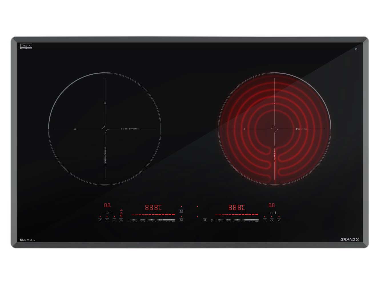 Đây là điểm đặc biệt của GX E795Lux. Vùng nấu bên trái là bếp từ cảm ứng với công suất mạnh mẽ 2.300W và chế độ Booster đạt 3.000W giúp đun sôi siêu tốc. Vùng nấu bên phải là bếp hồng ngoại với hai vòng nhiệt linh hoạt, công suất tối đa 2.200W/1.000W, cho phép sử dụng được với mọi loại nồi, kể cả nồi thủy tinh, gốm sứ hay gang, đáp ứng mọi nhu cầu và thói quen nấu nướng truyền thống.