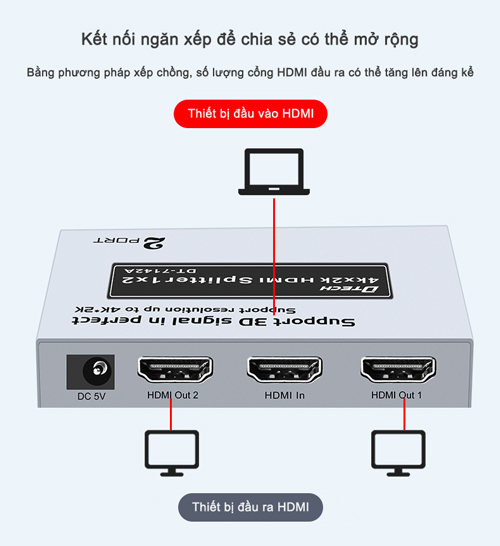 Mở Rộng Bằng Phương Pháp Chồng Lên Nhau (Cascading): Nếu nhu cầu sử dụng của bạn vượt quá 2 màn hình, DT-7142A cung cấp phương pháp mở rộng độc đáo. Quý khách hàng hoàn toàn có thể sử dụng phương pháp mở rộng chồng lên nhau (cascading) của nhiều thiết bị DT-7142A để nhân đôi số lượng đầu ra HDMI theo cấp số nhân (ví dụ: 1 ra 4, 1 ra 8, v.v.), đáp ứng mọi quy mô hệ thống.