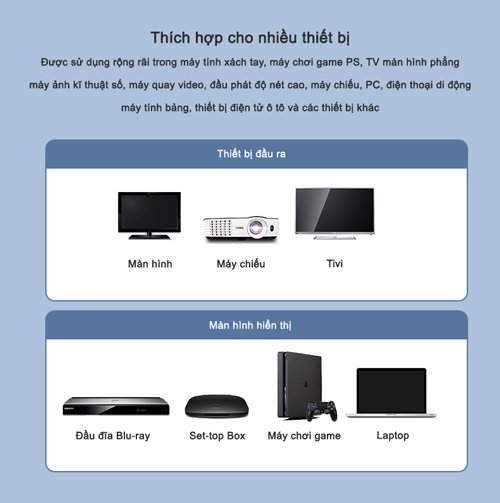 Tương Thích Đa Thiết Bị: Người dùng có thể yên tâm sử dụng với các thiết bị phổ biến như TV thông minh, màn hình máy tính, PC, Laptop, đầu phát HD, Console Game, và nhiều thiết bị khác mà không phải lo ngại về vấn đề kết nối.