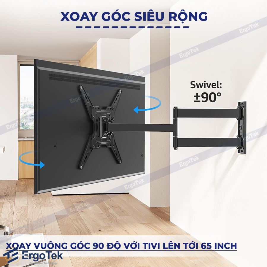 Xoay vuông góc tiện lợi: Khả năng xoay tivi đến góc vuông ($90^{\circ}$) so với tường là một tính năng đột phá, giúp tối ưu hóa góc xem từ nhiều vị trí khác nhau trong phòng. Điều này đặc biệt hữu ích trong các không gian có bố cục mở hoặc phòng khách lớn.
