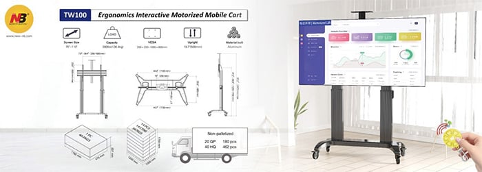 Hệ Thống Nâng/Hạ Tự Động: Điểm đặc biệt nhất của NB TW100 là cơ chế giúp nâng/hạ Tivi một cách tự động, dễ dàng hơn. Hệ thống điều khiển thao tác nhanh và đơn giản, cho phép người dùng thay đổi độ cao của Tivi mà không cần dùng sức.