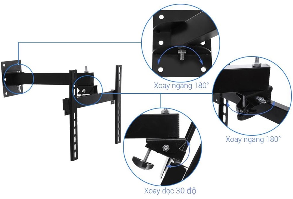 Góc Xoay Rộng 180°: Đây là tính năng nổi bật nhất của sản phẩm. Khung cho phép tivi xoay ngang một góc lên đến 180°, giúp người dùng có thể xem tivi từ hầu hết mọi vị trí trong phòng. Sự linh hoạt này đặc biệt hữu ích cho các không gian mở, phòng ăn kết hợp phòng khách, hoặc những nơi cần xem tivi từ nhiều khu vực khác nhau.