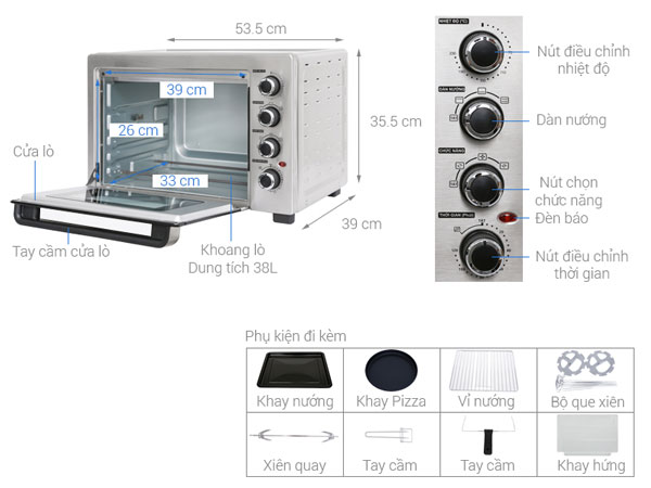 Dung tích 38 lít: Lò có dung tích lớn, lý tưởng cho các gia đình từ 4-6 người. Bạn có thể nướng gà nguyên con, nướng tảng thịt lớn hoặc nhiều loại thực phẩm cùng lúc, tiết kiệm tối đa thời gian.