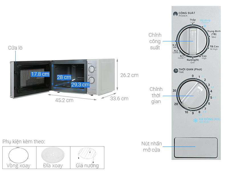 Phụ kiện đầy đủ: Lò đi kèm với đầy đủ các phụ kiện như vòng xoay, đĩa xoay và giá nướng, giúp bạn tối ưu hóa việc sử dụng cho từng chức năng, từ hâm nóng đến nướng.