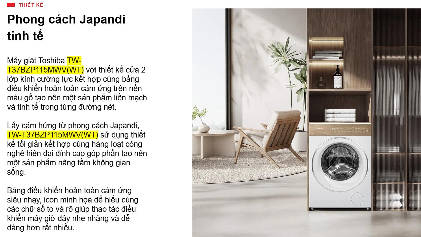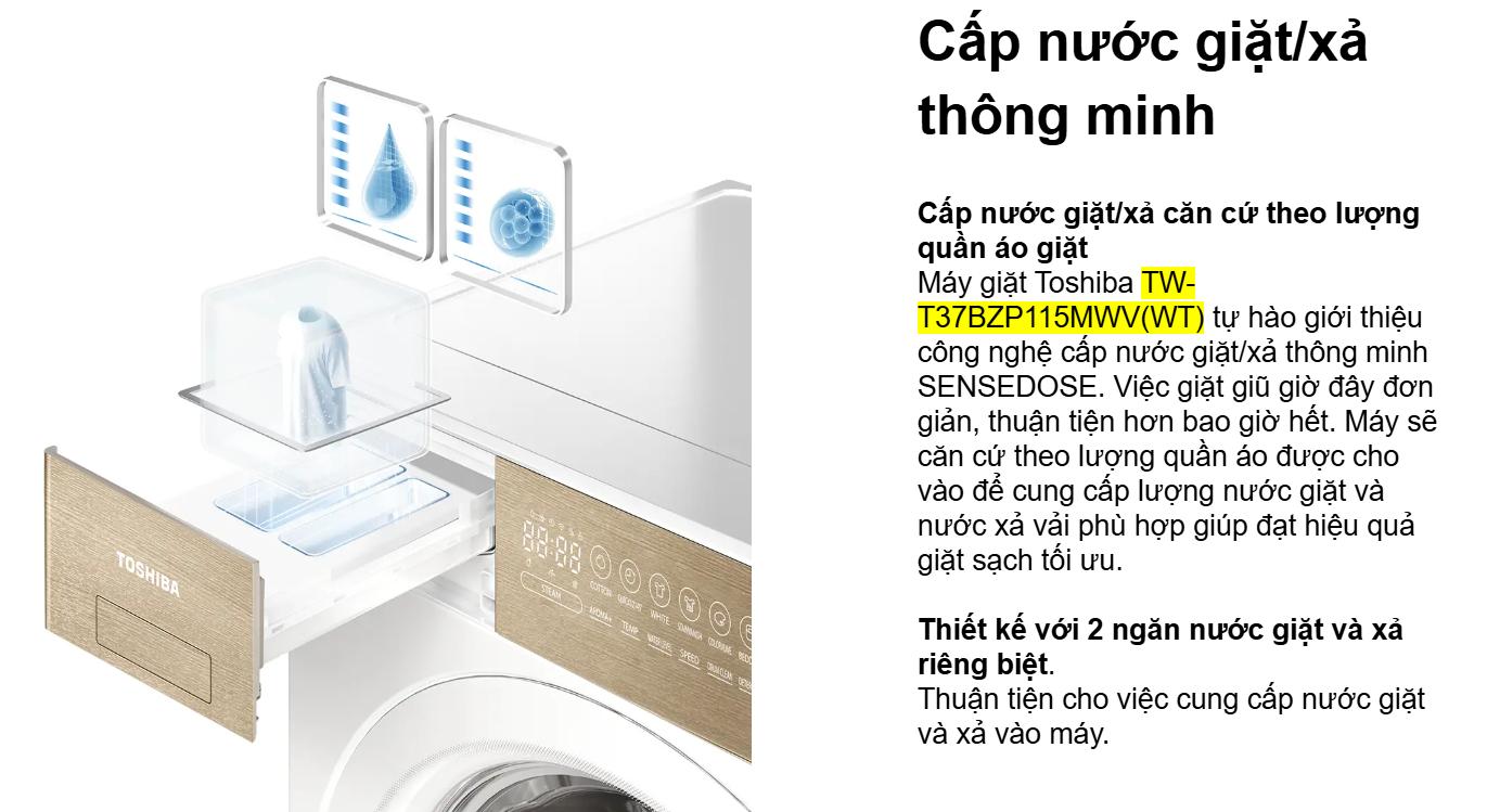 Trong kỷ nguyên công nghệ gia dụng năm 2026, máy giặt Toshiba mã hiệu TW-T37BZP115MWV(WT) khẳng định vị thế là dòng sản phẩm cửa trước cao cấp, hội tụ những tinh hoa công nghệ giặt giũ hiện đại nhất. Với khối lượng giặt 10.5 kg, thiết bị TW-T37BZP115MWV(WT) không chỉ đáp ứng hoàn hảo nhu cầu cho các gia đình đông thành viên mà còn mang đến trải nghiệm thẩm mỹ đỉnh cao với thiết kế vân gỗ sang trọng. Sự kết hợp giữa bộ xử lý AI Smart, công nghệ siêu bọt khí UFB Pro và khả năng kết nối TSmartLife biến mẫu máy này thành một trợ thủ đắc lực, nâng tầm chất lượng sống cho mọi ngôi nhà.