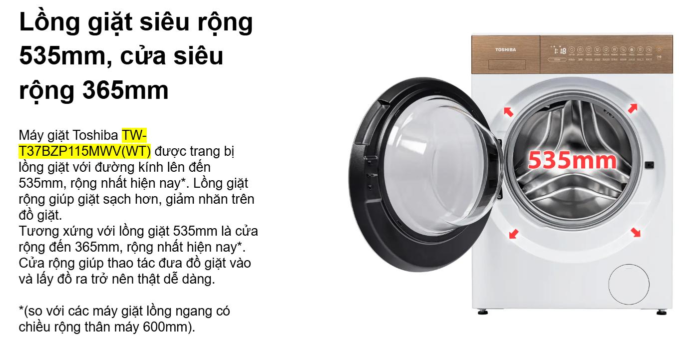 Cửa giặt siêu rộng 365 mm: Giúp người dùng dễ dàng đưa vào hoặc lấy ra các loại đồ giặt cồng kềnh như chăn ga, gấu bông mà không gặp bất kỳ trở ngại nào cùng mẫu TW-T37BZP115MWV(WT).