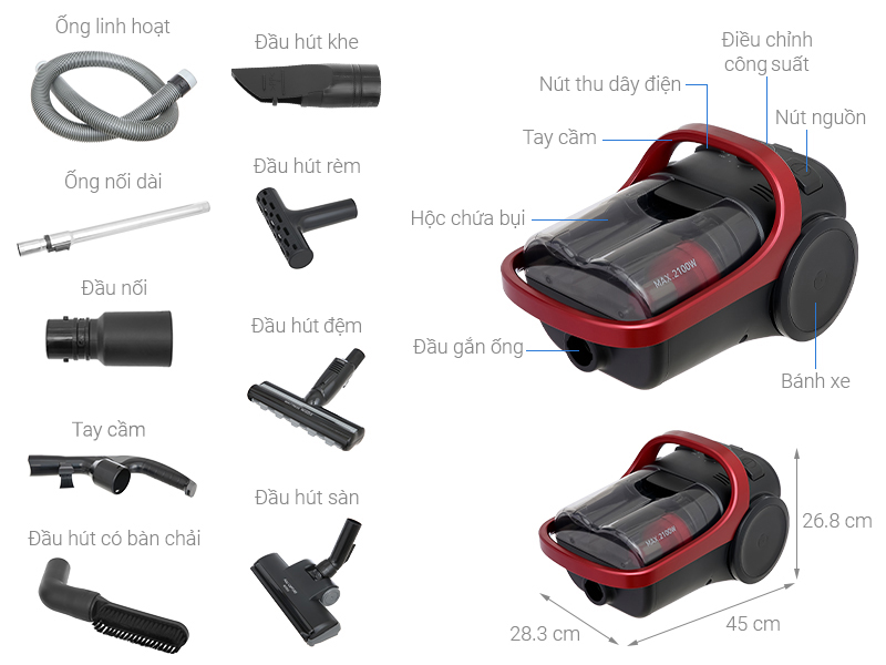 Vệ sinh toàn diện từ sàn đến trần: Máy đi kèm với 5 loại đầu hút chuyên biệt, giúp bạn dễ dàng làm sạch mọi khu vực trong nhà:
