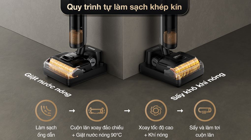 Tự vệ sinh Nước Nóng 90°C và Sấy khô Tốc độ cao: Sau khi sử dụng, máy tự động thực hiện quy trình làm sạch khép kín tại đế sạc: Giặt cuộn lăn bằng nước nóng 90°C để tẩy sạch bụi bẩn, vi khuẩn, dầu mỡ, sau đó sấy khô bằng khí nóng (chế độ siêu tốc 90°C trong 5 phút hoặc tốc độ cao 85°C trong 30 phút) để ngăn ngừa nấm mốc và mùi hôi.