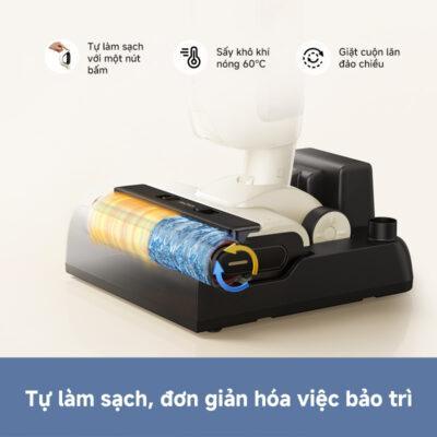 Tự Giặt và Sấy Khô Cuộn Lăn: Sau khi dọn dẹp, cuộn lăn được tự động giặt bằng chuyển động xoay đảo chiều, sau đó sấy khô bằng khí nóng 60°C, giúp ngăn ẩm mốc, khử mùi và giữ cuộn lăn luôn sạch sẽ, sẵn sàng cho lần sử dụng tiếp theo.