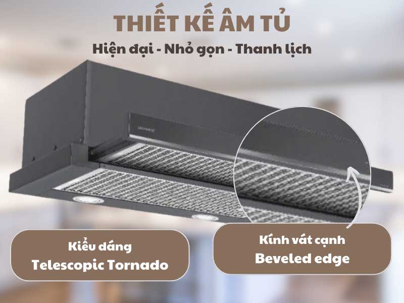 Máy hút mùi sở hữu thiết kế theo phong cách Telescopic Tornado, mang đến sự gọn gàng và hiện đại cho không gian bếp. Thiết kế âm tủ giúp sản phẩm ẩn mình một cách tinh tế, tiết kiệm không gian, phù hợp với cả những căn bếp nhỏ nhưng vẫn đảm bảo hiệu quả hút mùi tối ưu.