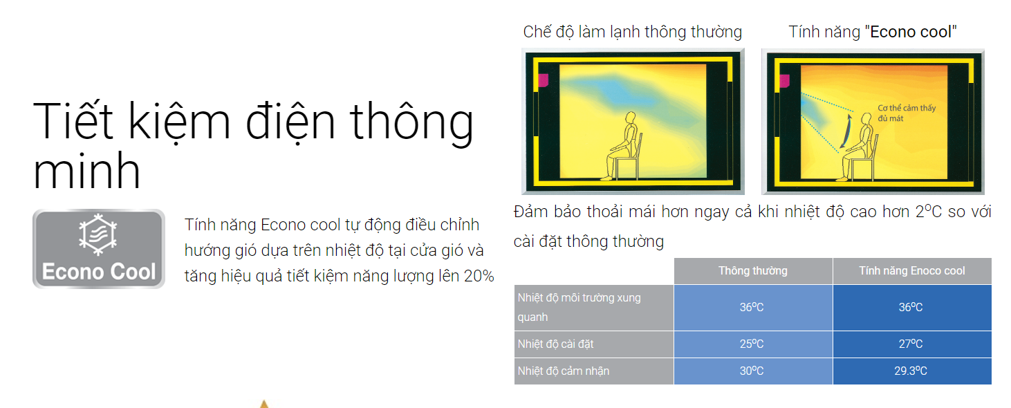 Bên cạnh đó, chế độ Econo Cool trên dòng máy MSY-GR35VF hoạt động dựa trên cơ chế cảm biến nhiệt độ tại cửa gió. Khi phát hiện các khu vực có nhiệt độ cao hơn, máy sẽ tự động điều chỉnh hướng gió thổi trực tiếp vào nơi đó. Điều thú vị là khi kích hoạt Econo Cool, máy lạnh MSY-GR35VF có thể tự động tăng nhiệt độ cài đặt thêm 2 độ C mà người dùng vẫn cảm thấy mát mẻ như bình thường. Sự điều chỉnh thông minh này giúp tiết kiệm thêm 20% chi phí điện năng nhưng vẫn duy trì được môi trường không khí thoải mái nhất cho người sử dụng.