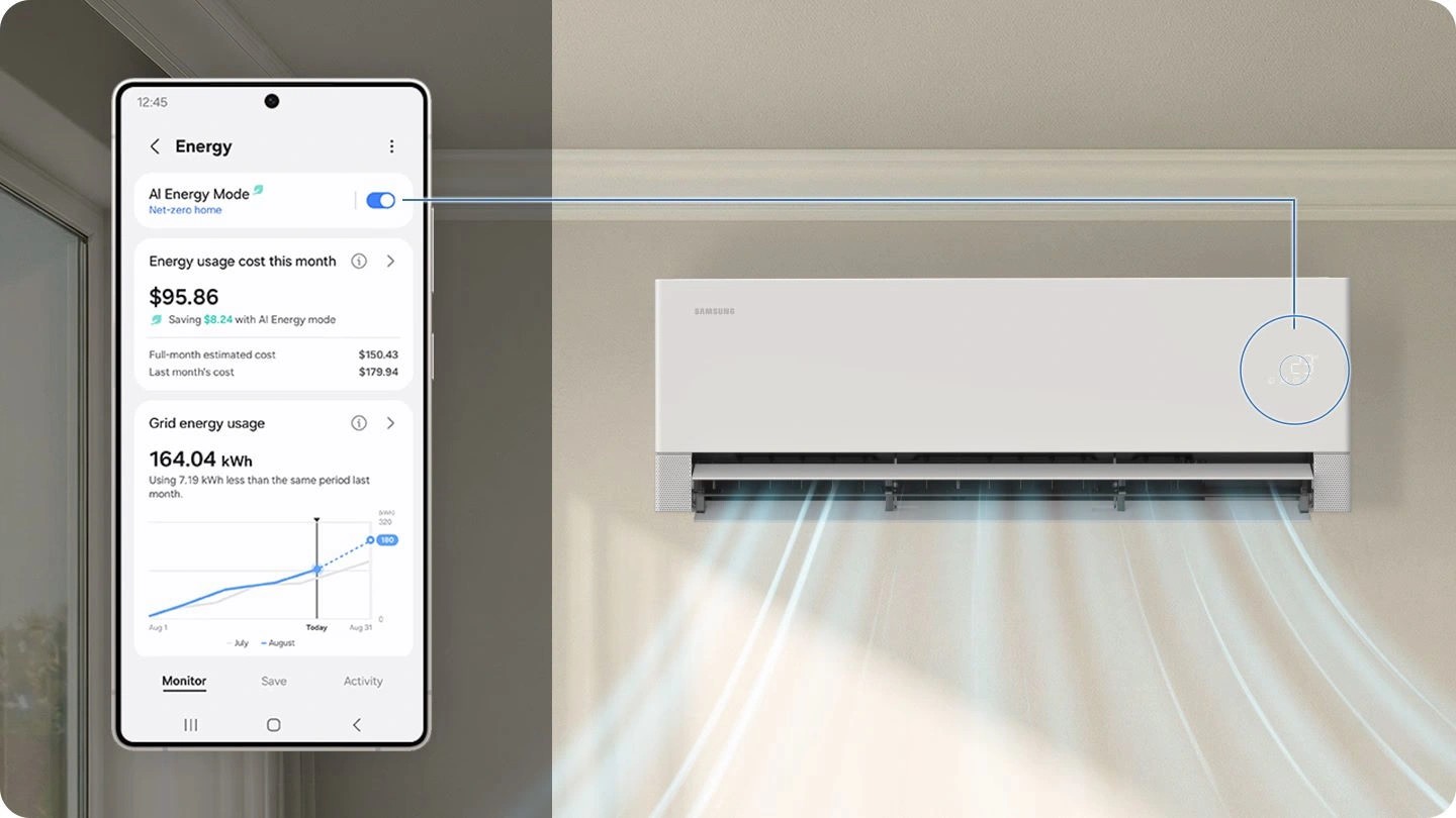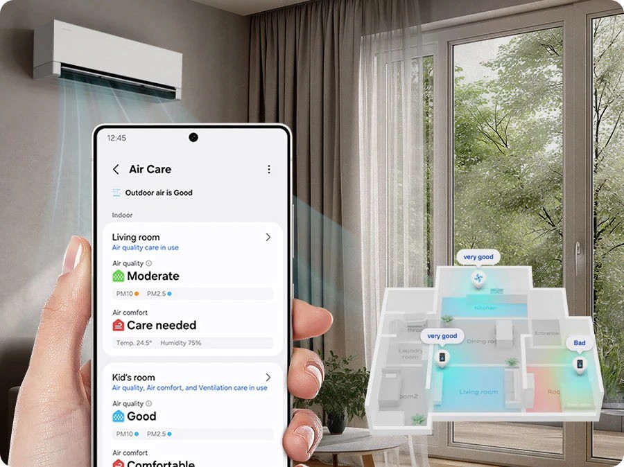 Sự tiện nghi của AR70H18D1BWNSV được mở rộng thông qua ứng dụng SmartThings trên điện thoại. Bạn có thể điều khiển máy từ xa, kiểm tra mức tiêu thụ năng lượng hoặc cài đặt các kịch bản sử dụng thông minh như Welcome Cooling (làm mát sẵn khi bạn sắp về nhà) hay Away Care (tự động tắt khi bạn rời đi). Khả năng tương tác bằng giọng nói thông qua trợ lý ảo giúp việc vận hành thiết bị trở nên hiện đại và thú vị hơn bao giờ hết.
