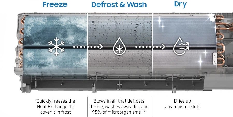 Để duy trì hiệu suất bền bỉ, Samsung trang bị cho AR70H18D1BWNSV công nghệ Freeze Wash độc đáo. Bằng cách đóng băng và rã đông dàn trao đổi nhiệt, máy sẽ tự động cuốn trôi mọi bụi bẩn và dầu mỡ tích tụ bên trong. Kết hợp với chế độ Auto Clean làm khô 3 bước, thiết bị luôn được giữ ở trạng thái sạch sẽ nhất, loại bỏ mùi hôi và nấm mốc một cách triệt để mà không cần tốn quá nhiều công sức bảo dưỡng.