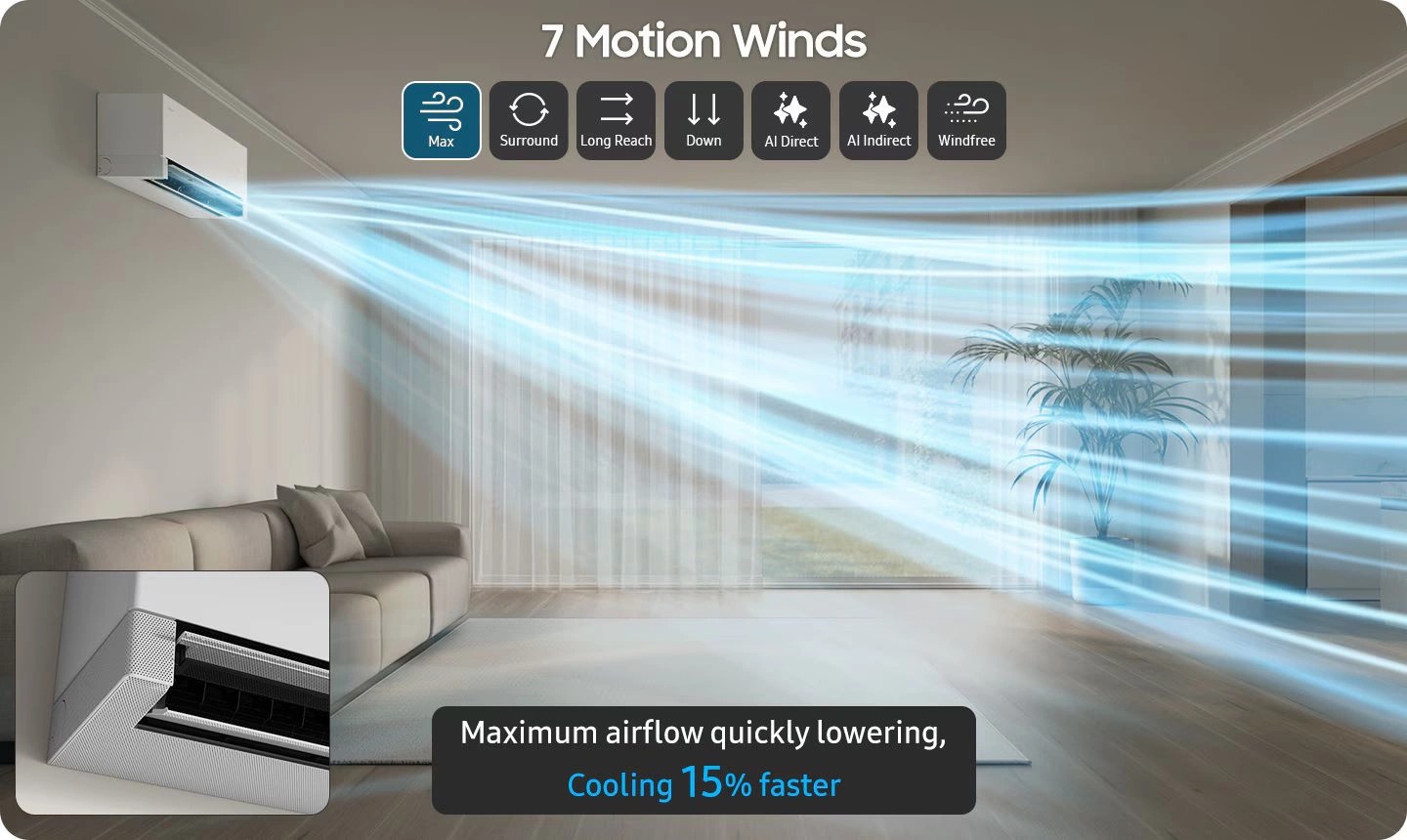Hệ thống trí tuệ nhân tạo trên AR70H18D1BWNSV còn sở hữu 7 chế độ gió đa dạng, từ Max Wind làm lạnh nhanh hơn 15% đến Surround Wind phân bổ khí lạnh đồng đều. Khả năng tự động hóa này giúp người dùng tận hưởng sự thoải mái tuyệt đối mà không cần phải điều chỉnh thủ công quá nhiều, mang lại trải nghiệm cá nhân hóa sâu sắc ngay trong chính ngôi nhà của mình.