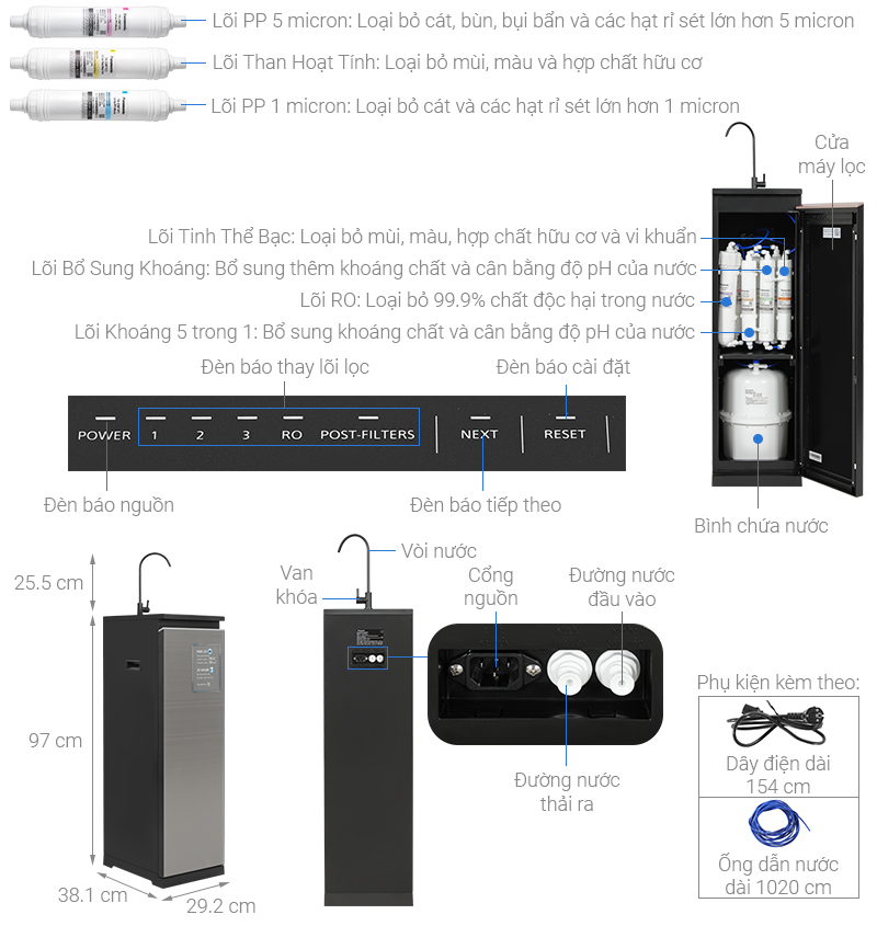 Lõi RO (Hàn Quốc): Trái tim của hệ thống lọc, loại bỏ 99.9% các chất độc hại, vi khuẩn, virus, kim loại nặng và hóa chất, đảm bảo nước tinh khiết tuyệt đối.