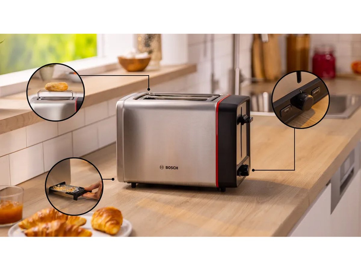 Vỏ Thép Không Gỉ Bền Bỉ: Máy nướng bánh mì Bosch TAT6M420 sở hữu vỏ ngoài làm từ thép không gỉ cao cấp, mang lại vẻ ngoài sang trọng, hiện đại và độ bền vượt trội. Chất liệu này không chỉ dễ dàng vệ sinh mà còn hài hòa với mọi phong cách nội thất bếp, từ cổ điển đến hiện đại.