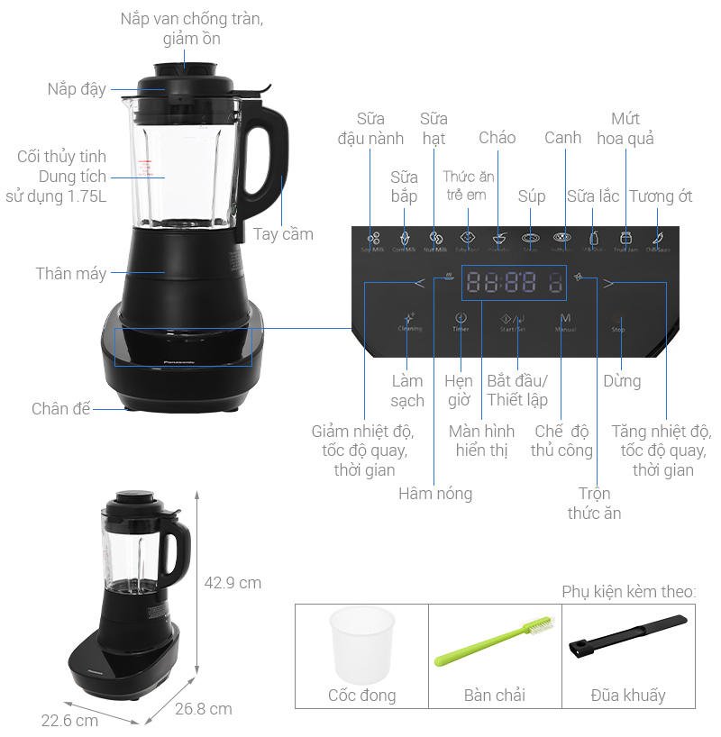 Thiết kế hiện đại, bền bỉ: Máy có thiết kế gọn gàng, hiện đại với thân nhựa màu đen chống bám bẩn, dễ dàng lau chùi. Cối xay được làm từ chất liệu thủy tinh cao cấp, có khả năng chịu nhiệt và chống vỡ, đảm bảo an toàn tuyệt đối khi xay nấu thực phẩm ở nhiệt độ cao.