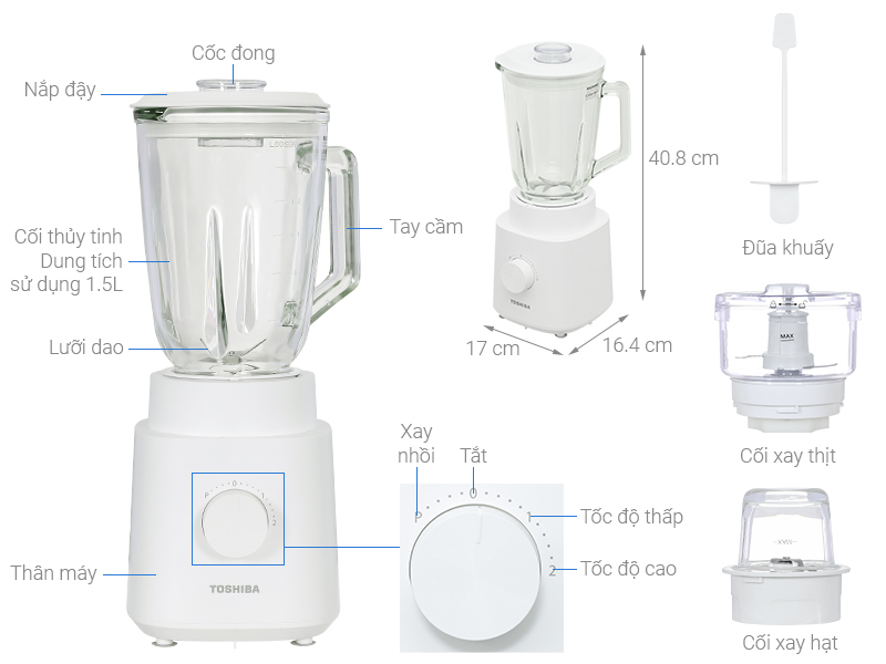 | Tiện ích khác | Chân đế chống trượt, Có nắp nhỏ cho nguyên liệu khi xay, Lưỡi cắt tháo rời |