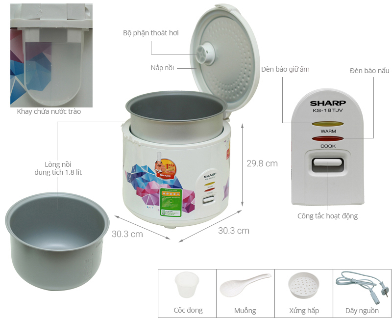 Phụ kiện đi kèm: Có xửng hấp, muỗng lấy cơm và cốc đong gạo.