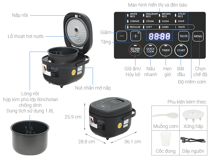 Dung tích 1.8 lít: Phù hợp cho gia đình từ 4 đến 6 người, đáp ứng nhu cầu ăn uống hàng ngày.