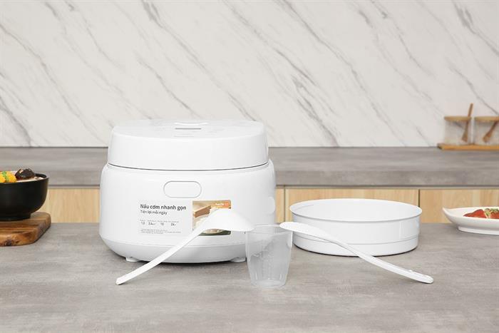 Bộ phụ kiện đầy đủ: Bộ phụ kiện đi kèm bao gồm xửng hấp, cốc đong, muỗng canh và muỗng cơm, đáp ứng mọi nhu cầu nấu nướng cơ bản của gia đình.