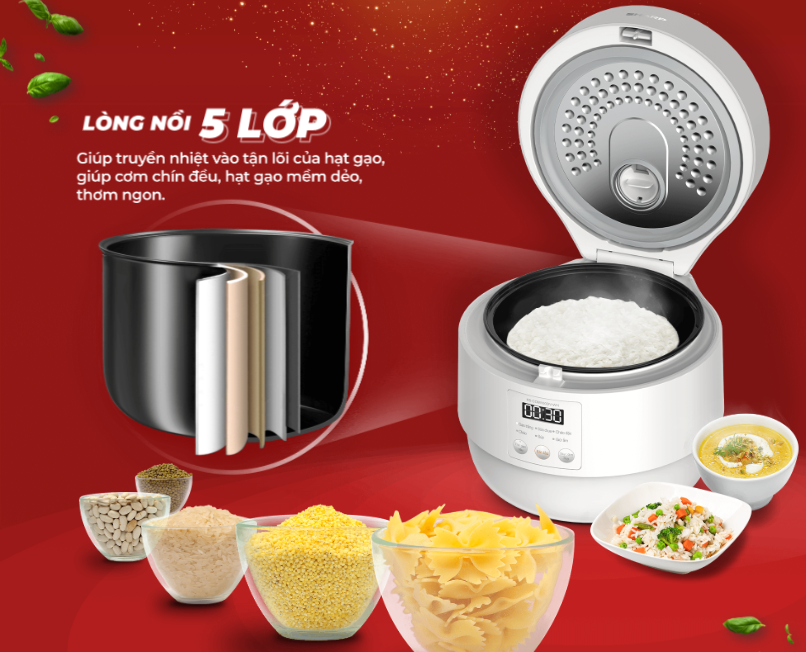 Lòng Nồi Cao Cấp 5 Lớp Chống Dính: Lòng nồi được làm từ chất liệu nhôm phủ chống dính cao cấp với 5 lớp, mang lại độ bền vượt trội. Chất liệu này không chỉ giúp truyền nhiệt tốt mà còn chống dính tuyệt đối, đảm bảo cơm không bị cháy hay dính đáy. Việc vệ sinh sau khi nấu cũng trở nên đơn giản hơn bao giờ hết.