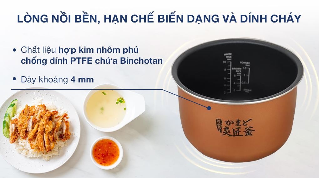 Lòng nồi của Toshiba RC-18DR5UVN(W/H) được chế tạo từ hợp kim nhôm bền chắc, với độ dày ấn tượng 4mm. Độ dày này không chỉ tăng cường độ bền cho sản phẩm mà còn giúp truyền nhiệt nhanh chóng, đồng đều và giữ nhiệt lâu hơn. Nhờ đó, hạt cơm sẽ được nấu chín tới, dẻo thơm và giữ ấm hiệu quả, không bị khô hay sượng.
