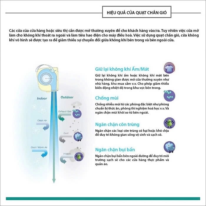 Giữ Lạnh Tuyệt Đối: Chức năng cốt lõi của quạt là tạo ra một màng chắn khí ngăn cách toàn bộ môi trường không khí của bên trong và bên ngoài. Điều này cho phép bạn sử dụng điều hòa nhưng vẫn có thể mở cửa một cách thoải mái.