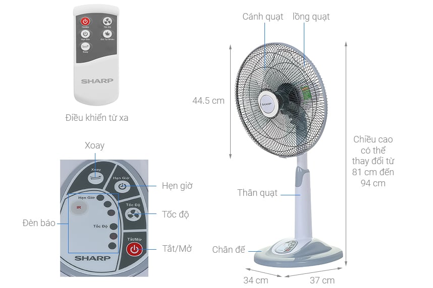 Điều chỉnh chiều cao: Chiều cao của quạt có thể điều chỉnh linh hoạt từ 81cm đến 94cm, giúp bạn tùy chỉnh hướng gió phù hợp với mọi vị trí, từ sàn nhà đến giường ngủ.