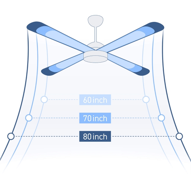 Quạt sở hữu 8 cánh quạt cùng sải cánh dài đến 200cm. Đây là kích thước lớn nhất trong các dòng quạt trần dân dụng, đảm bảo khả năng tản gió và lưu thông không khí hiệu quả trên phạm vi siêu rộng, phù hợp tuyệt đối cho:
