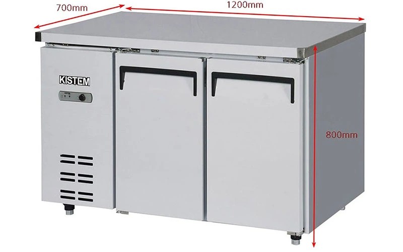 Tủ bàn lạnh 1200 KIS-XDT12R được thiết kế dạng tủ bàn nằm ngang với chiều dài 1200mm, phù hợp với nhiều không gian bếp khác nhau – từ rộng rãi đến hạn chế diện tích. Bề mặt trên là bàn inox phẳng, chắc chắn, có thể sử dụng để sơ chế thực phẩm hoặc làm khu vực chuẩn bị nguyên liệu.